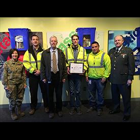 Materials Recycling Facility (MRF) Operations Supervisor Brian Dubis was presented with a Patriot Award by the Rhode Island Employer Support of the Guard and Reserve (ESGR), in recognition of his overwhelming support of Army National Guard Spc. Edwin Rivera, MRF Working Supervisor. Edwin nominated Brian for taking on additional tasks on multiple occasions while Edwin fulfilled his military obligations. Following the presentation of the award, Executive Director Mike OConnell signed a Statement of Support affirming Resource Recovery's commitment to support Service members and comply with the Uniformed Services Employment and Reemployment Rights Act (USERRA). We deeply appreciate our service members and all that they contribute to our organization and country.