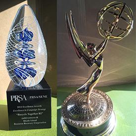 The Southeastern New England Chapter of the Public Relations Society of America (PRSA/SENE) presented Resource Recovery and partner (add)ventures with a 2012 Excellence Award for our Recycle Together RI campaign. This award recognizes outstanding public relations tactics and campaign strategies. In addition, (add)ventures also won a Boston/New England Emmy Award for Outstanding Commercial for its production of our Recycle Together RI TV commercial, recognizing their creativity in producing a commercial that raised awareness about the (then) new, statewide mixed recycling program.