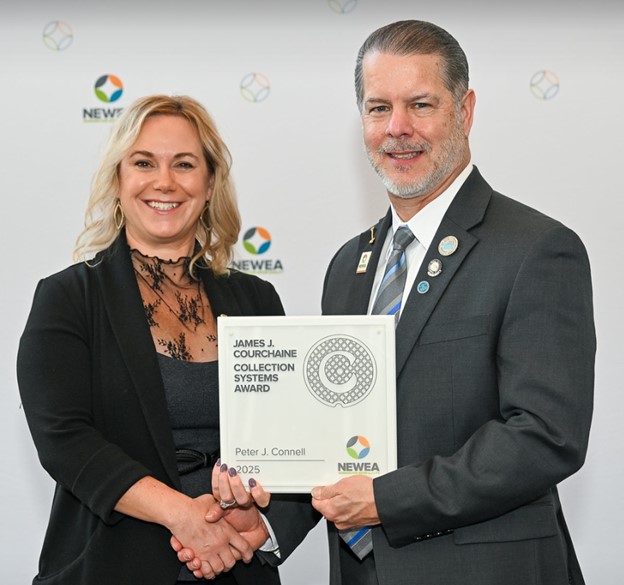The New England Water Environmental Association (NEWEA) presented Peter Connell the James J. Courchaine Collection Systems Award. The award honors NEWEA member James J. Courchaine for his many contributions to the Collection Systems field. The award is given to a NEWEA member to recognize their outstanding efforts in the operation, maintenance, management, or design of a wastewater collections system. The award recipient exemplifies the dedication essential to continuously improve a wastewater collection systems’ capability to adequately, cost-effectively, and safely service its community’s ongoing needs.